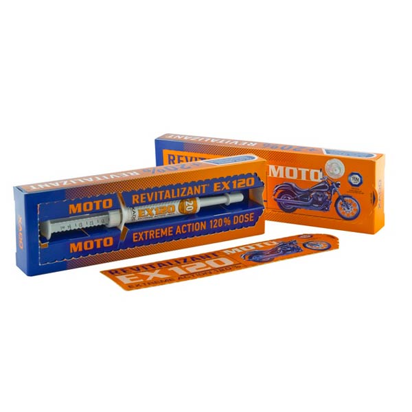 Revitalizant EX120 MOTO je zasnovan kot zaščita proti obrabi, za obnovo in za zaščito motorjev motorne opreme s kombiniranim ali z ločenim mazalnim sistemom z zmogljivostjo do 1000 cm³ (za motorna kolesa, motorne sani, osebna plovila in gospodinjska motorna oprema itd.).